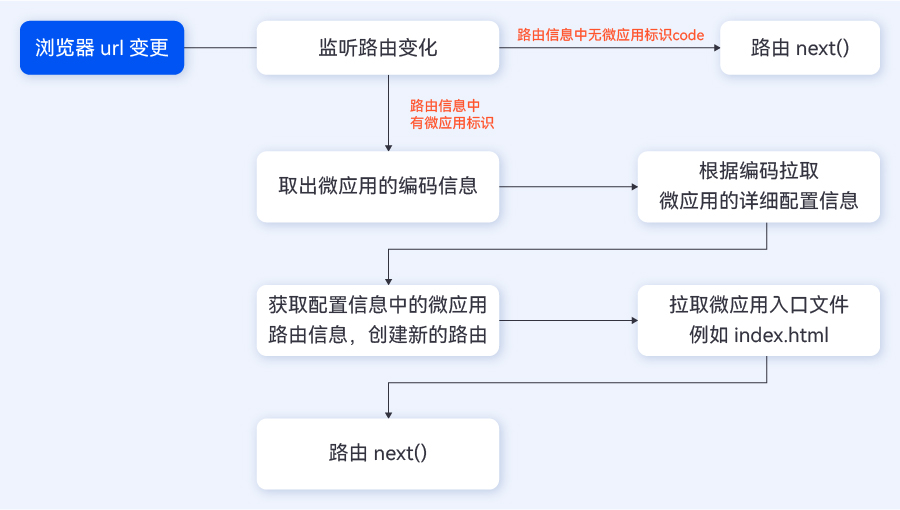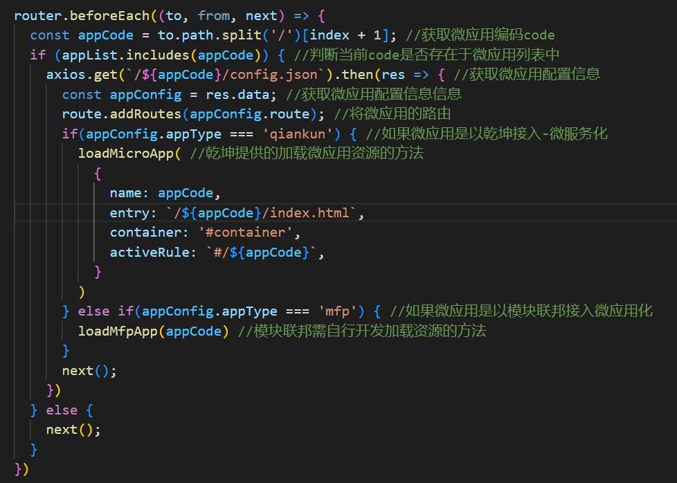 這里需要注意的是,考慮到微應用的動態加載,加載器加載的微應用個數不做限制,如一次性將所有的微應用路由全部加載,勢必會造成路由數據過于龐大,因此初始化時只注冊中心路由,微應用對應的頁面路由,則在第一次進入當前微應用的時候創建。此步驟放在loader加載器中實現。