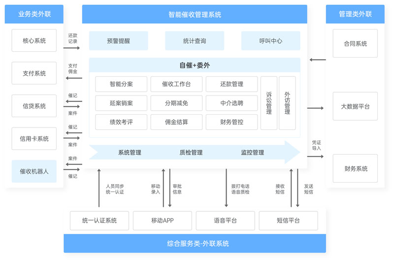 運用先進的動態評分及風險定價模型、多級智能策略、大語言模型等人工智能技術,以案件管控為導向,以提高催收效率和合規催收作業為雙目標,從金融行業不良資產催收處置全流程出發,實現業務和管理的結構化、流程化、精細化、標準化、智能化,達到防范化解經營風險、規范業務操作、輔助管理決策、提高工作效率、促進業務發展、降低管理成本、提高催收效益的目的。