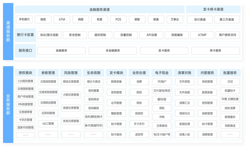 基于SunCard銀行卡平臺,廣泛吸收已有客戶的先進業(yè)務經(jīng)驗,學習已有客戶的優(yōu)質(zhì)業(yè)務模型,以普惠客戶為出發(fā)點,具備以客戶為中心,以產(chǎn)品為業(yè)務框架,以卡體系為業(yè)務實體,以合約為業(yè)務紐帶,以事件為業(yè)務驅(qū)動,輔以靈活多變的賬戶體系與計價體系的松耦合、高擴展、高效穩(wěn)定的,完全自主知識產(chǎn)權(quán)的特點。系統(tǒng)包含卡管、密鑰管理、數(shù)據(jù)準備、電子現(xiàn)金、制卡用卡五大微服務群,為銀行提供借記卡全方位的業(yè)務處理支持。
