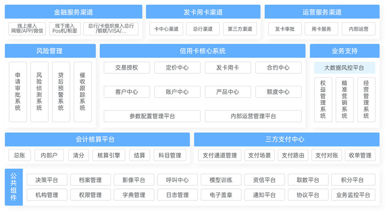 系統貫穿商業銀行信用卡全生命周期,可提供包括風險、賬務、管理、營銷等在內的整體IT解決方案,具備業務產品創新與快速迭代能力、互聯網能力與安全風控并存的優勢,有著豐富的交易元素與定價策略,通過數據驅動交易鏈條上的各個環節、細化管理精度、提升管理時效,為銀行經營管理提供智能決策。