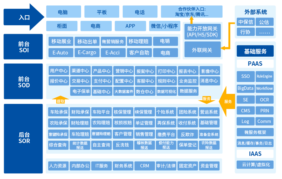 根據(jù)Gatner在2016年提出的一份《Pace-Layered Application Strategy》報(bào)告,按照“步速”將企業(yè)的應(yīng)用系統(tǒng)劃分為三個(gè)層次,SOR(Systems of record ),SOD(Systems of differentiation)和SOI(Systems of innovation),保險(xiǎn)企業(yè)的整體架構(gòu)可按前臺、中臺和后臺相對應(yīng)進(jìn)行劃分。
