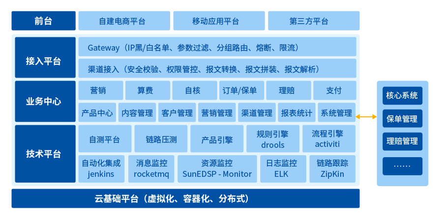 長亮保泰新一代基于互聯(lián)網(wǎng)架構(gòu)的保險(xiǎn)業(yè)務(wù)中臺,采用云架構(gòu)+微服務(wù)概念,打造集用戶管理、在線承保、在線理賠、特色服務(wù)、動態(tài)交流、智能化等功能為一體的全覆蓋業(yè)務(wù)平臺。并偕同保險(xiǎn)大數(shù)據(jù)分析方案為保險(xiǎn)公司科技轉(zhuǎn)型升級、科技賦能提供堅(jiān)定的科技支撐。