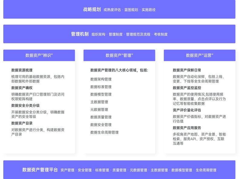 以數據治理為基礎,覆蓋數據戰略規劃、管理機制、數據資產的識管用以及數據資產管理平臺四部分,通過對數據資產的梳理盤點、確權、分類分級、安全管理、標準化管理、質量治理、全生命周期管控,以及智能化的數據資產保鮮、運營、應用等服務,實現數據資產的可見、管好、好用的目標,確保數據資產共享流通的低成本、高效率與安全合規,助力發揮數據資產價值。