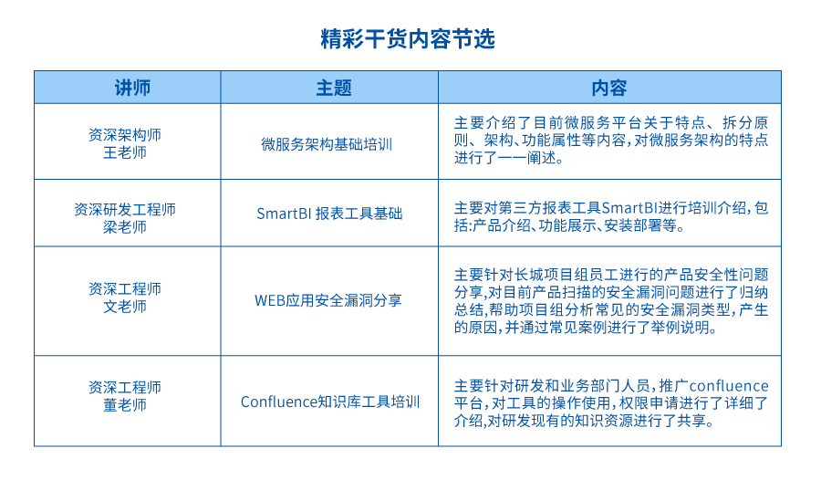 長亮科技認(rèn)為,員工對企業(yè)文化及戰(zhàn)略目標(biāo)的認(rèn)知和認(rèn)同是讓我們成為一家人的基礎(chǔ),因此會在培訓(xùn)中安排較大比例的相關(guān)內(nèi)容,且均由公司高層領(lǐng)導(dǎo)作為直接講師;另外一部分就是根據(jù)崗位需求的因材施教,本期新員工主要崗位涉及java、功能顧問、測試崗等,因此本期培訓(xùn)課程主要覆蓋業(yè)務(wù)相關(guān)的產(chǎn)品及功能介紹、jraf開發(fā)技能及環(huán)境搭建、微服務(wù)等重點專業(yè)技術(shù)培訓(xùn)指導(dǎo)、具體操作實踐等,讓新員工有針對性地成長為專業(yè)人才。