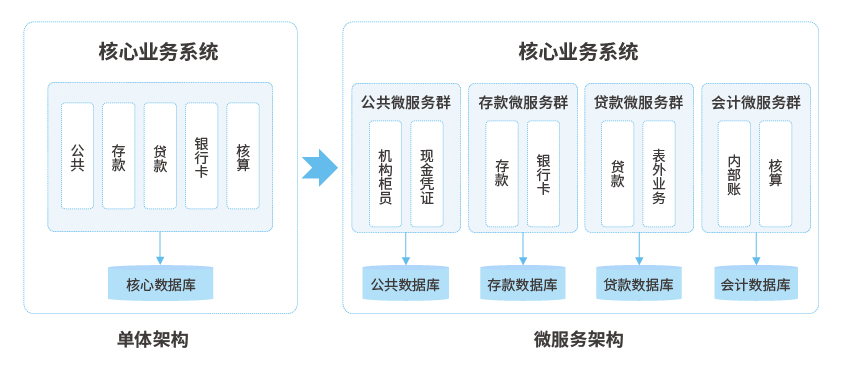 一、微服務(wù)架構(gòu),按業(yè)務(wù)模塊進(jìn)行服務(wù)拆分,比如:存款、貸款等;