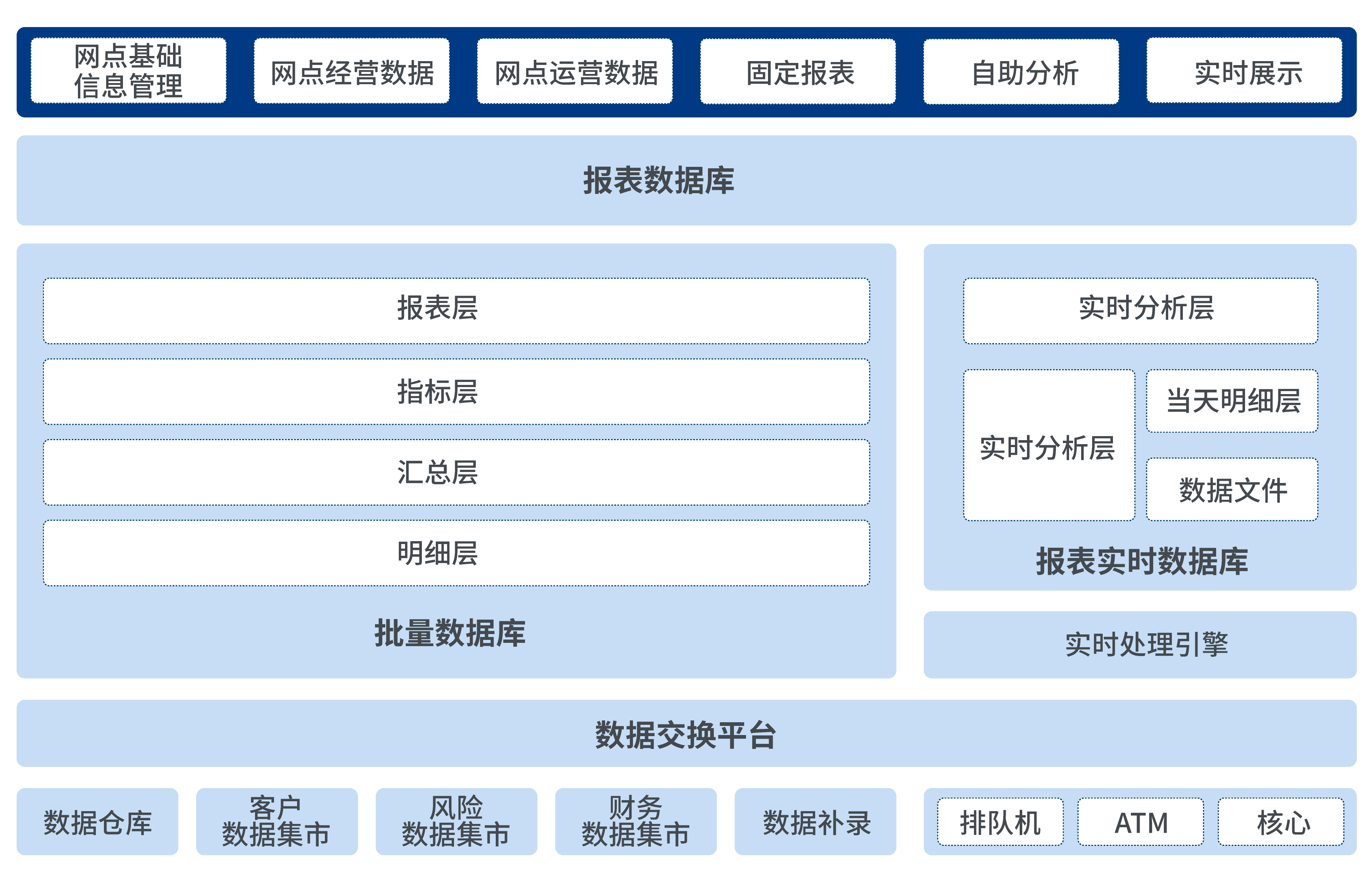 該方案在批量數(shù)據(jù)層面,全面整合業(yè)務(wù)系統(tǒng)客戶、財(cái)務(wù)、風(fēng)險(xiǎn)等業(yè)務(wù)領(lǐng)域數(shù)據(jù),實(shí)現(xiàn)對(duì)網(wǎng)點(diǎn)經(jīng)營(yíng)績(jī)效的全面分析;在實(shí)時(shí)數(shù)據(jù)層面,對(duì)接柜面、ATM、自助查詢機(jī)、VTS、排隊(duì)機(jī)等渠道系統(tǒng),支持對(duì)網(wǎng)點(diǎn)運(yùn)營(yíng)效率的實(shí)時(shí)監(jiān)控管理?;诤蠖说臄?shù)據(jù)支持,通過(guò)豐富的展示方式向管理人員提供宏觀和微觀業(yè)務(wù)運(yùn)營(yíng)狀況,為網(wǎng)點(diǎn)管理人員提高網(wǎng)點(diǎn)服務(wù)水平、網(wǎng)點(diǎn)的效益、工作效率做服務(wù)支撐。