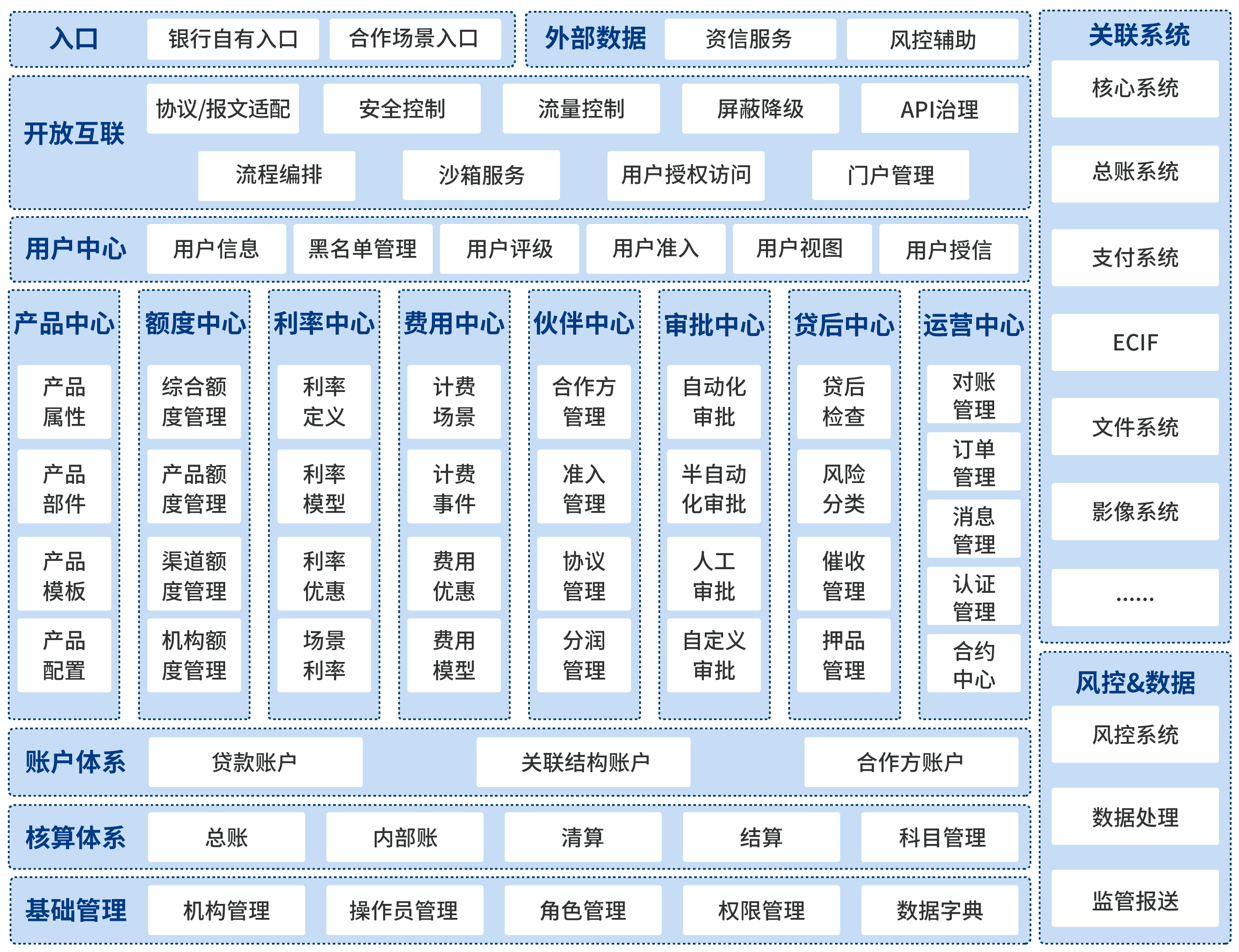 支持引入渠道合作方和消費融資類場景,打造客戶和商戶的快速融資產品。基于交易信息和商圈的“信用評價體系”,通過接入大數據實現自動授信、在線營銷、快速融資&風控&放貸,隨時隨地為客戶提供全面的融資服務。