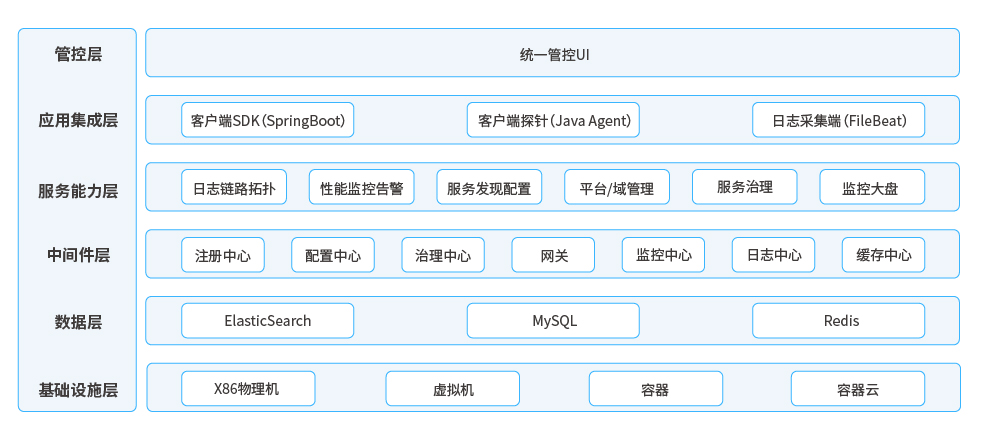 ● 集成層:主要針對微服務應用提供治理服務集成能力,主要包括客戶端集成SDK、客戶端性能和鏈路探針、客戶端日志收集代理;