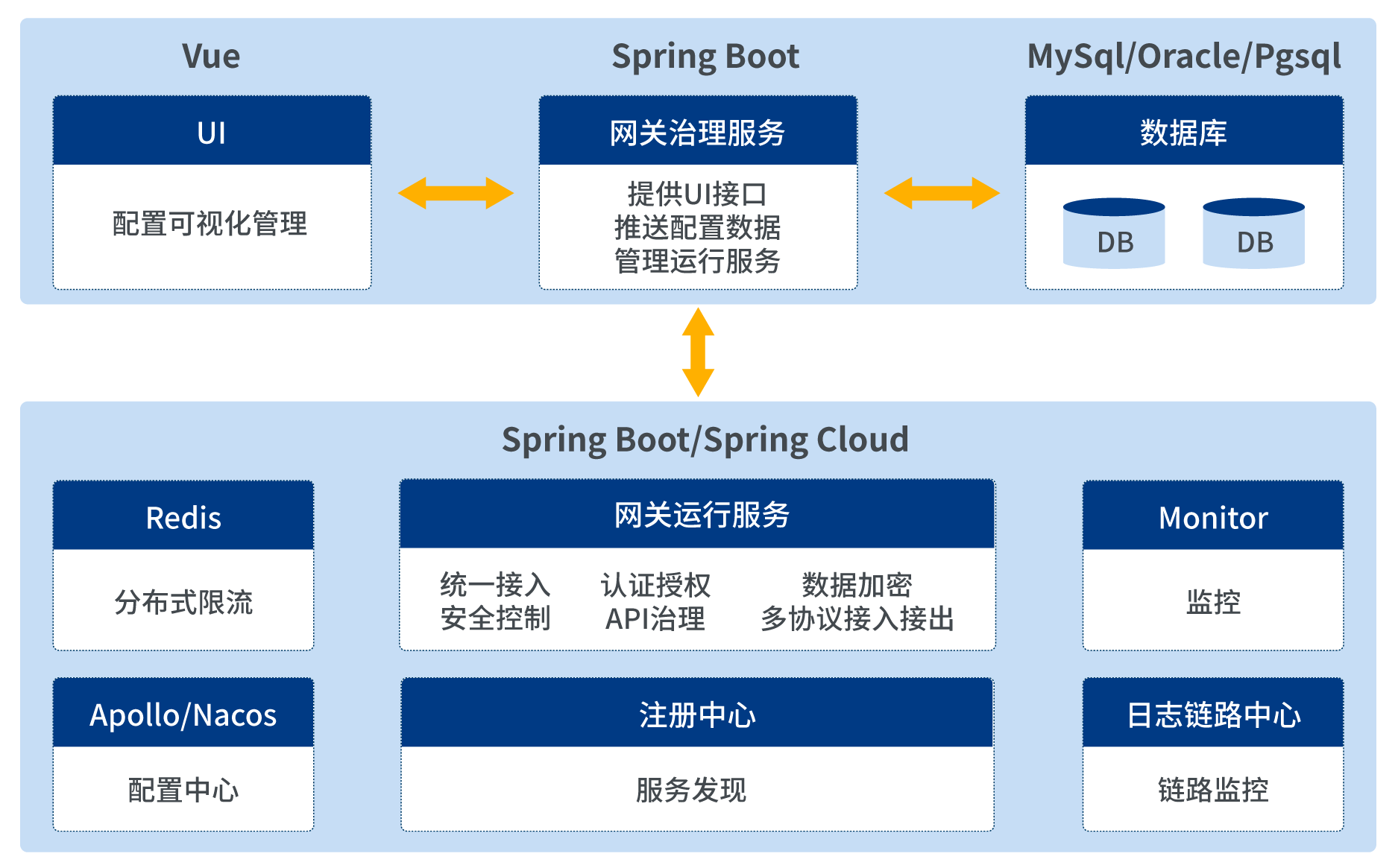 API網(wǎng)關(guān)采用前后端分離架構(gòu)模式,以Java語言開發(fā),選用當前主流技術(shù)棧Spring Boot,Spring Cloud體系。