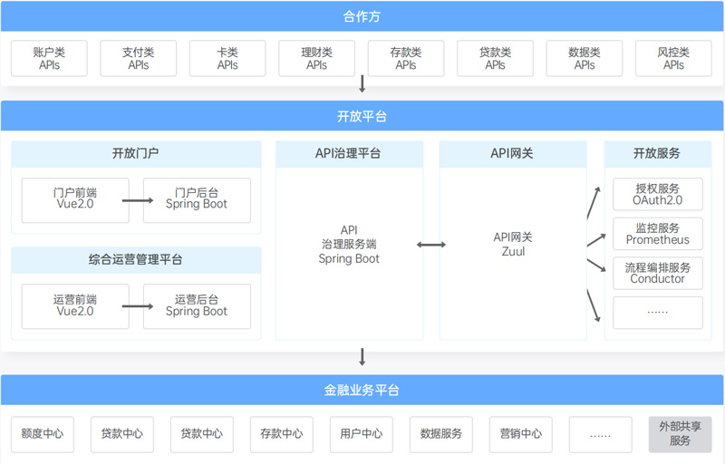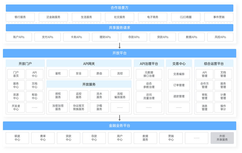 定位于基于微服務(wù)架構(gòu)、采用服務(wù)可視化編排技術(shù)的開放服務(wù)平臺(tái),滿足渠道與行內(nèi)系統(tǒng)的通訊協(xié)議適配、報(bào)文適配、通訊安全、流量控制、交易路由、服務(wù)編排、渠道管理、接口管理等,以及整合行內(nèi)金融能力包括但不限于賬戶、產(chǎn)品、支付等,連接外部合作方及行外系統(tǒng),通過API、SDK、H5等開放模式快速對接不同行業(yè)生態(tài)場景,進(jìn)而深入到多種業(yè)務(wù)場景,最終實(shí)現(xiàn)完整的銀行金融服務(wù)與企業(yè)級(jí)運(yùn)營能力的輸出。